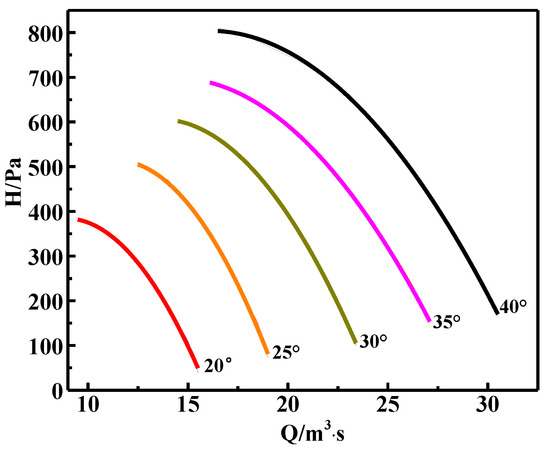 In the fan boundary of this simulation, the corresponding wind pressure interval parameters need to be entered, and the corresponding flow rate will also change at each full pressure value. Therefore, the whole of this fan characteristic curve function can be used as a boundary condition as a variable input. In this paper, the K45-6 axial fan is simulated and selected, and the fan characteristic curve functions of the fan blade angle are 20°, 25°, 30°, 35°, and 40°, respectively. As is shown in Table 5.