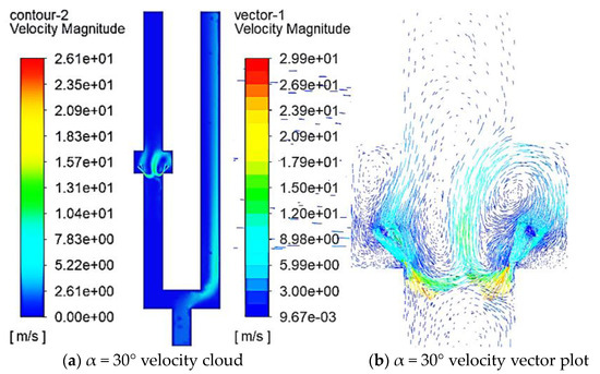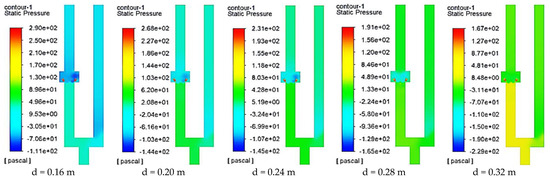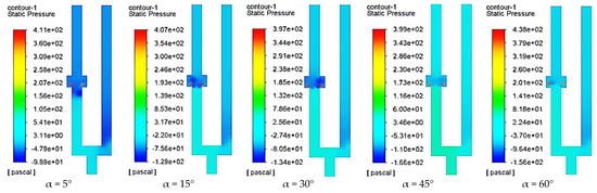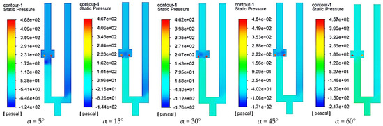 Figure 7, Figure 8 and Figure 9 show pressure clouds of the fan blade angles of the air curtain at 20°, 25°, and 30° and the jet working at different angles. It can be seen that under the action of the air curtain, the pressure distribution of the roadway undergoes a very obvious change. The roadway pressure cloud map where the air curtain is located can be divided into three parts, namely, the chamber position and upstream and downstream of the roadway wind flow. As shown in the figure, it can be seen that the upstream position of the roadway is green, and the downstream is light blue. This is due to the action of the air curtain, which causes the pressure upstream of the roadway wind flow to be significantly greater than that downstream of the roadway, resulting in a partition pressure difference.