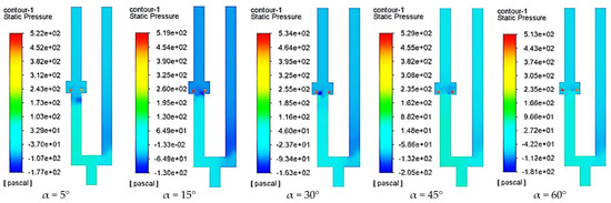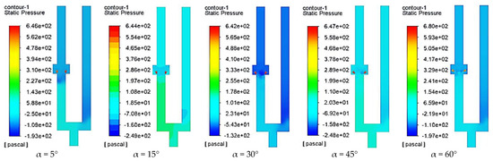 As one of the main factors affecting the efficiency of a multi-machine parallel circulation air curtain, the jet air supply angle directly determines the strength of its air flow ability to partition a roadway [25]. When an air curtain works to isolate the air flow of a roadway, the static pressure difference generated before and after it is called the effective pressure of the air curtain, that is, the partition pressure difference of the air curtain [26]. This indicator can directly reflect the barrier capacity of the air curtain. The simulation is divided into five parts, which are the numerical simulation of different jet angles under the full pressure of the fan blade at 20°, 25°, 30°, 35°, and 40°, from which the relationship between the full pressure of the fan and the pressure difference of the separator can be judged. The jet angle at each fan blade angle is set to 5°, 15°, 30°, 45°, and 60°. The outlet width is set to 0.16 m, and the outlet height is 1.7 m. The simulation results of different jet angles under different full pressures of different fans are analyzed and compared by intercepting Y = 0.86 m sections.
