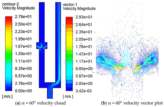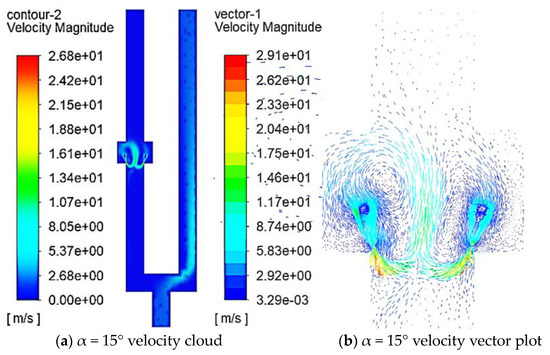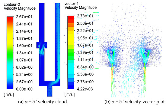 It can also be seen from Figure 7, Figure 8 and Figure 9 that when the air curtain is 5°, 15°, and 30°, the jets ejected by the air curtain on both sides of the chamber position collide and merge in the middle of the roadway, forming a closed air curtain, and the ability to resist the roadway wind flow is strong. When the jet angle is 45° and 60°, the blue color of the chamber position is lighter, indicating that the local negative pressure formed is small, and the jets ejected by the air curtains on both sides also collide in the middle of the roadway.