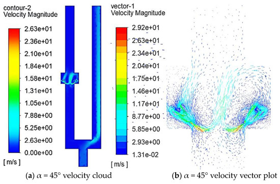 From Figure 10 and Figure 11, it can be seen that the color of the chamber position is close to downstream of the roadway wind flow, and there is no obvious difference. This shows that there is no circulating air flow between the inlet and outlet of the air curtain on both sides of the chamber, that basically no completely closed air curtain is formed, and that the effect of isolating the air flow of the roadway is not exerted. Comparing the results of the same angle in Figure 7, Figure 8 and Figure 9 shows that when the fan blade angle of the air curtain fan is 35° and 40°, the working nature changes, and the air curtain may show the phenomenon of excessive partition, which needs to be further analyzed and determined from the specific data.