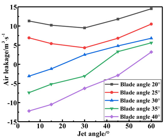 - In order to more simply and clearly judge the effect of the multi-machine parallel air curtain isolation roadway wind flow, as well as the transition critical point of blocking and diversion air flow, an air leakage index is introduced. When the air leakage volume is positive, it means that the air curtain is blocking the air flow. When the air leakage volume is negative, it means that the blocking of air flow begins to shift to the pilot air flow. When the jet angle, outlet width, and full pressure of the air curtain change, the critical point of intercepting the wind flow and the transition of the induced wind flow can be directly judged.