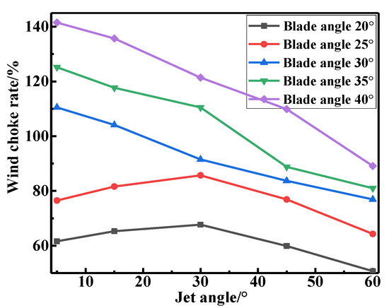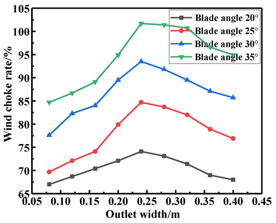 When the fan blade angle is 35°, it can be seen that the choke rate increases with the increase in the outlet width. When the outlet width is increased to 0.24 m, the wind choke rate reaches 101.7%, and the wind flow from intercepting roadway to draining air flow begins to change.