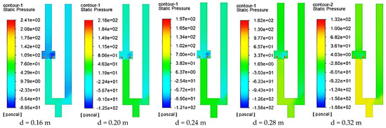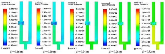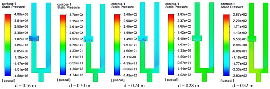 It can be seen in Figure 20 that when the fan blade angle is 20° and the air curtain width is 0.16 m, the color upstream of the roadway is a very dark green and the pressure value is positive. As the width of the air curtain gradually increases to 0.32 m, the color upstream of the roadway gradually changes from dark green to light green and finally to yellow, but the color downstream also gradually warms, so the resulting partition pressure difference changes. In Figure 21, Figure 22 and Figure 23, the colors of the upper and lower reaches of the roadway also show the same change pattern as in Figure 20. Since the model adopts a three-dimensional large-section roadway, there will be local wind flow disorder. In order to reduce the error, the entire section of the roadway is taken 20 m upstream and downstream of the chamber, and the pressure average of the entire section is calculated using Fluent, and then the partition pressure difference generated by the air curtain is calculated.