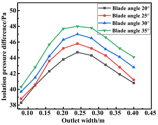 When the fan blade angle is 20° and the air curtain outlet width is 0.08 m, the partition pressure difference generated by the air curtain is 38.3 Pa, and the partition effect is the worst. When the outlet width increases to 0.20 m, the isolation pressure difference increases to a certain extent, and the growth rate is large. As the outlet width continues to increase, so does the isolation pressure difference. When the outlet width is increased to 0.24 m, the partition pressure difference reaches the maximum, and the multi-machine parallel air curtain at this time has the strongest ability to resist the roadway air flow and the isolation effect is the best. As the outlet width continues to increase, the isolation pressure differential begins to decrease. By analyzing the folded lines at the angle of the fan blade of 25°, 30°, and 35° and different outlet widths, the same law as above can be obtained. This shows that under the full pressure of any fan, with the increase in the outlet width of the air curtain, the isolation pressure difference shows a trend of first increasing and then decreasing, and the ability to intercept the air flow of the roadway is first enhanced and then weakened. The partition effect reaches its best when it is 0.20~0.24 m.