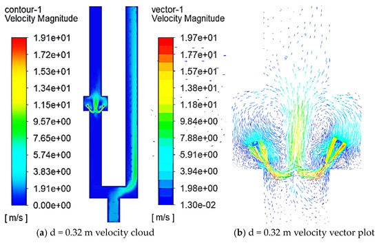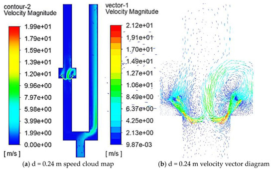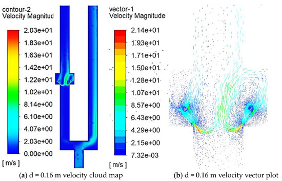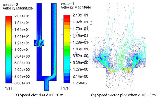 Due to the large number of models, only the velocity clouds and velocity vectors of the air curtain at different widths at a fan blade angle of 20° are listed here. The results are shown in Figure 25.