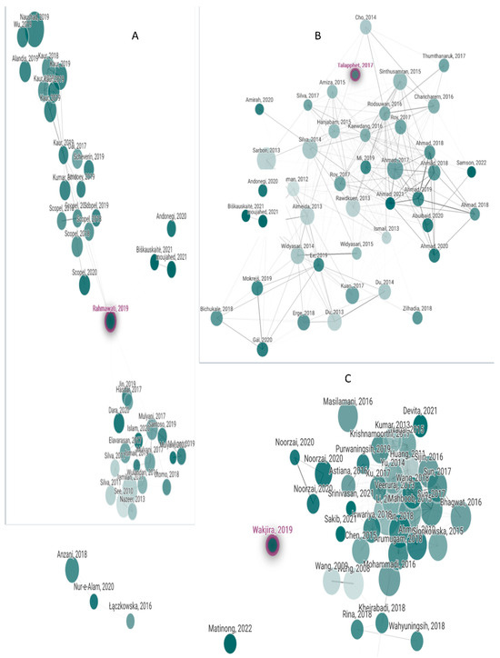 Representation of key research articles on solid tannery waste recycling for animal feed production. The figure visualizes pivotal papers as interconnected nodes, each signifying its relevance in the field: (A) results from the search terms “tannery waste AND recycling”, (B) derived using “wet blue AND recycling”, (C) based on the words “beef tallow AND tanneries”. Each node represents an article, and the interconnections hint at related research or shared citations. Source: connected papers (accessed on 29 August 2023).