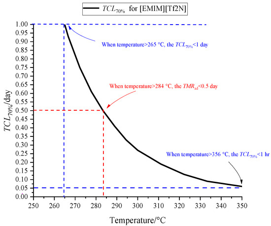 The TCL is an essential parameter for evaluating reaction intensity and hazard levels. It denotes the time needed for a specific quantity of the substance to be consumed at a particular ambient temperature. As depicted in Figure 4, when the ambient temperature is under 265.0 °C, more than 70% of the substance engages in the reaction within a day. This insight emphasizes the importance of supervising ambient temperature during [EMIM][Tf2N]’s storage and transportation.