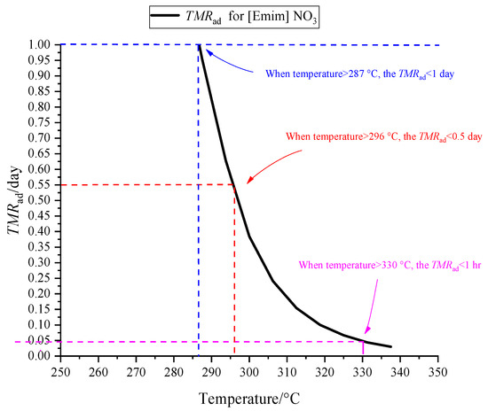 Figure 5 demonstrates the calculation of TMRad (time to reach the maximum rate of adiabatic decomposition) across various ambient temperatures. When the temperature surpasses 280 °C, [EMIM][Tf2N]’s TMRad is achieved within a day, with this tendency further decreasing as temperatures rise. However, effective monitoring of temperature regulation during operation, storage, and transportation can ensure stability and process protection. Personnel needs to be alert to scenarios where temperature increases due to heat accumulation, even in low-temperature conditions. In such instances, a decomposition reaction may be initiated, leading to elevated overall temperatures and reaction rates, potentially resulting in thermal runaway.