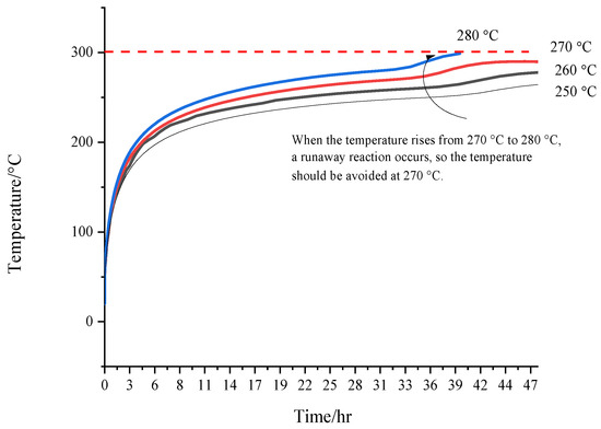 Figure 6 explores the effects of heat accumulation properties on substance storage safety. Temperature is crucial for determining if a substance will experience a runaway reaction due to decomposition in subsequent storage states. When the temperature is close to 270 °C, the curve of the rising temperature of [EMIM][Tf2N] suggests no risk of a runaway reaction. However, if the temperature climbs to 280 °C, a thermal runaway reaction will transpire, and the increased ambient temperature reduces the time needed to achieve a runaway reaction. Furthermore, the storage amount of substances and the container type can impact the thermal runaway mode. The altered temperature curve indicates that a runaway reaction will cause a rapid temperature increase in a brief period.