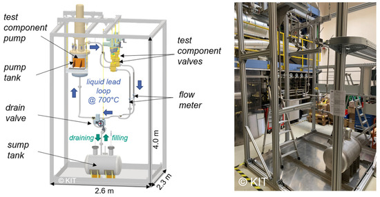 The blue arrows indicate the flow direction of the liquid lead in the high-temperature loop. At the top, the pump and valves of the project partner KSB SE & Co. KGaA, which are to be tested, are shown. The pump is a centrifugal pump and will be immersed into a so-called “pump tank”. The pump is designed to convey max. 4 m3/h liquid lead up to a height of 4.5 m, which corresponds to ca. 4.5 bar. The pump and the valves are connected to the pipes with a DN25 flange. Upstream of the test valves, the liquid metal flow is determined by flow meters that are based on the Venturi effect and are designed according to ISO 5167-4 [21]. The sump tank is the lowest part of the loop. In case of an emergency, the liquid metal, which is circulating in the upper part of the loop, is drained into this tank. It also holds the liquid before the start of operation and when the test rig is not in operation. At the start of operation, the drain valve is open and gas pressure is used to force the liquid metal into the upper part of the loop. In order to keep the lead in a liquid state at all times, trace heating is installed at the outer surface of all liquid-metal-containing parts of the test rig. The trace heating is also used to heat up the medium and keep it at 700 °C for the high-temperature component test. During operation, the drain valve is closed, and approximately 60 L of liquid lead are in the upper part of the test rig (blue arrows in Figure 2(left)). For thermal insulation to the environment, a combination of layered mineral wool (Insulfrax® mat and ProRox®) is used. An insulation thickness of 200 mm ensures a maximum surface temperature of the loop of less than 60 °C. This ensures safety aspects regarding protection against contact and burns.