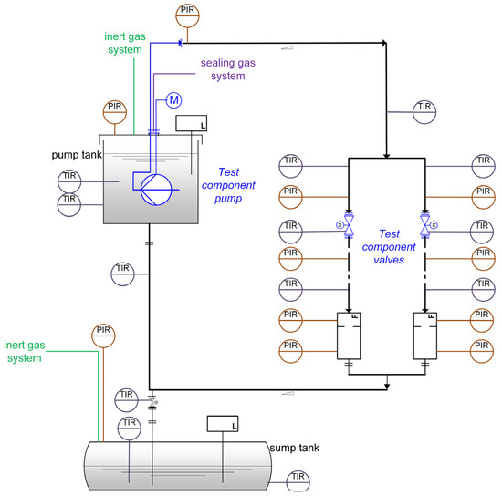 Argon is used as a cover gas in the loop to prevent the formation of lead oxide. Argon is also used as the sealing gas for the rotating mechanical seal of the pump. The piping and instrumentation diagram (PID) of the test rig is shown in Figure 3. The test components (pump and valves) are highlighted in blue. The absolute gas pressure in the sump and the pump tank (PIR) will be measured with FESTO SPTW pressure transmitters. Furthermore, the differential pressure of both valves and both Venturi nozzles (F) is determined using Siemens pressure transducers and measuring instruments. The procedure for the pressure measurement is further explained in Section 3.6. The level (L) of the liquid metal in the tanks will be detected by BERU ZE 18-12 electrodes, which close an electric circuit once the electrically conductive liquid metal reaches the sensor. Bulk temperatures and surface temperatures (TIR) are measured with 91 thermocouples (type K) in total.