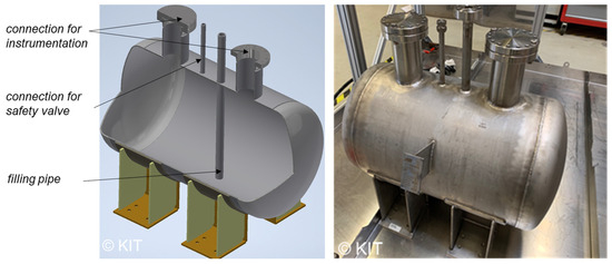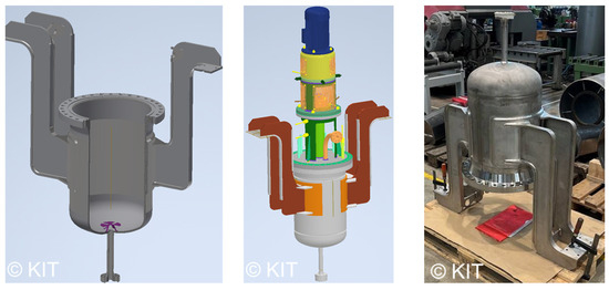 Figure 5 shows 3D designs of the pump tank with (centre) and without the immersed pump (left) and a photo after construction (right). It was designed in accordance with the AD2000 regulations [22] and in critical areas, a finite element analysis was performed. The pump tank was manufactured in-house. At the DN400 flange of the pump tank, connections for temperature, level and pressure are provided, as well as connections for the inert gas stream and the safety valve, which opens in case of an overpressure. The volume of the pump tank is approximately 70 L. From the pump tank, the circular flow of liquid lead passes the valves and the Venturi nozzles and goes back into the pump tank through a DN25 pipe. Metallic gaskets are used as sealings for the flange connections of the components to the DN25 pipe.