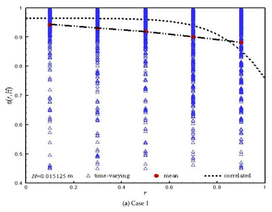 Figure 9 gives the radial porosity distribution at the section with a height of 0.015125 m for slugging cases 1 and 2. According to [2], the radial porosity is just a function of the dimensionless radius once the cross-sectional porosity is determined. This does not depend on the gas and particle flow rates. The simulated time-averaged cross-sectional porosity values at the height 0.015125 m are 0.912 and 0.907 for cases 1 and 2, respectively. The radial porosity in the MaFB can be correlated by the following equation [2]: