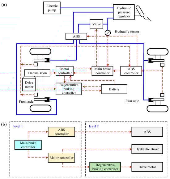 Composition and structure of regenerative braking system: (a) structural schematic diagram of the electric motor/hydraulic braking system and (b) hierarchical structure of the control system of electric vehicles.
