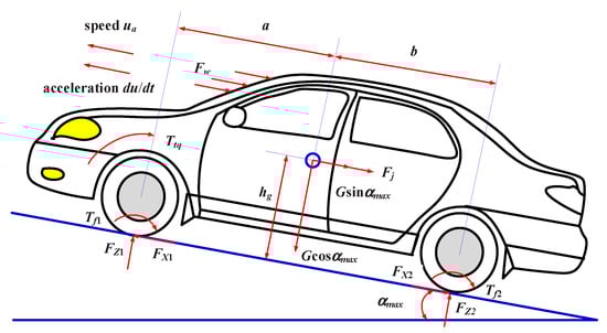 The dynamics of a vehicle are determined by two aspects: the driving force determined by the power unit and the vehicle’s adhesion properties determined by the tire–road friction coefficient. When a vehicle travels at equal speed on a horizontal road, it must overcome rolling resistance from the ground and air resistance from the air. When a vehicle is traveling uphill on a ramp, it must also overcome the force of gravity divided along the ramp, called slope resistance. When the vehicle accelerates, it also has to overcome the acceleration resistance. The rolling resistance Ff is due to hysteresis losses in the tires. The air resistance Fw is the component force of the air force in the direction of travel on a car traveling in a straight line. Gradient resistance Fi is the component force of the vehicle’s gravity along the ramp. Acceleration resistance Fj is the force of inertia that overcomes the accelerating motion of the mass of the car when it accelerates, including the inertia force of the translational mass and the moment of inertia of the rotating mass. The torque generated by the driving device is transmitted through the transmission system to the driving wheel, generating the driving torque Ttq. Under the action of Ttq, the driving wheel will exert a circumferential force on the ground, and the reaction force on the ground to the driving wheel is the driving force Ft. Based on driving force and various driving resistances, as shown in Figure 2, the driving equation of a vehicle is as follows [47]: