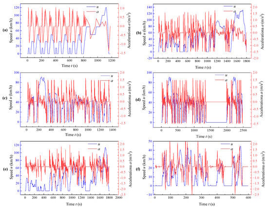 Speed u and acceleration a curves: (a) NEDC; (b) WLTC; (c) FTP-72; (d) FTP-75; (e) CLTC-P; (f) NYCC. (Readers can access this website https://www.epa.gov/vehicle-and-fuel-emissions-testing/dynamometer-drive-schedules, accessed on 13 October 2023).