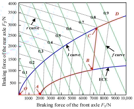 Depending on the I curve, ECE regulation curve, f curve, and r curve, the allocation rules for front- and rear-axle braking forces are specified with the braking strength z as the independent variable. As depicted in Figure 4, there are four steps regarding the braking force distribution on the front and rear axles of a vehicle: