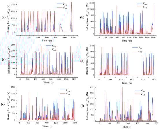 Braking force distribution of front and rear axles: (a) NEDC; (b) WLTC; (c) FTP-72; (d) FTP-75; (e) CLTC-P; and (f) NYCC.