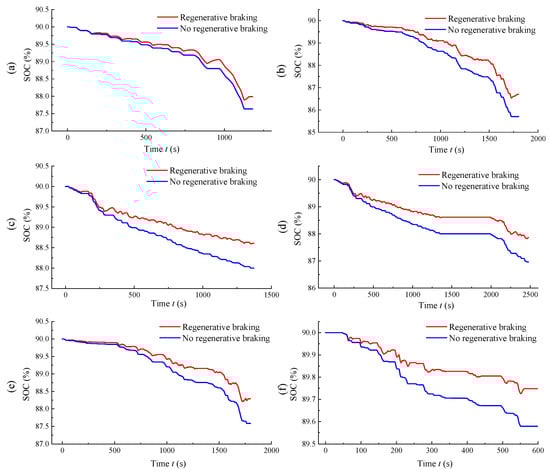 When an electric vehicle without regenerative braking experiences braking, the ΔSOCn between the SOC values at the end SOCend and the initial SOCint is directly related to the total energy Etotal. The ΔSOCy contains the energy recovered and stored in the battery Er for an electric vehicle with regenerative braking. Thus, the regenerative braking recovery efficiency ε can also be calculated as
