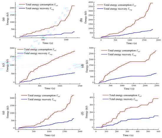 where Wf, Ww, Wh, and Wm are the work performed by rolling resistance, air resistance, hydraulic braking, and regenerative braking, respectively. Only Wm can be converted to electrical energy. The regenerative braking recovery efficiency εr can be expressed as the proportion of the braking energy recovered and stored in the battery Er to the total energy consumed by the braking system Etotal throughout the entire cycle, as shown below [63]: