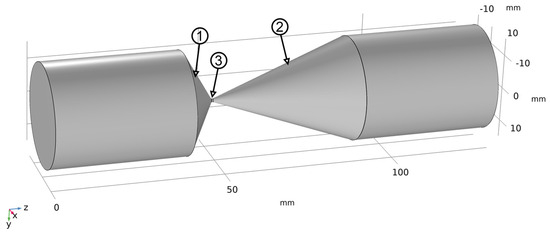 Computational domain in three-dimensional view, where ➀—convergent nozzle, ➁—transitional channel, ➂—divergent nozzle.