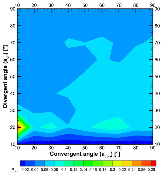 Change in cavitation zone () depending on the value of the convergent angle () and divergent angle ().