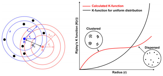 Figure 7 shows a schematic illustration of the operating principle of Ripley’s K-function for a two-dimensional domain.
