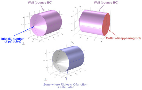 In the region with the minimum cross-sectional radius of the divergent nozzle (inlet), a number of particles were launched, while the calculation of Ripley’s K-function was carried out in the specified volume of a cylindrical shape (Figure 8). A bounce condition was applied to the walls, while at the outlet boundary, the particles were set to disappear: