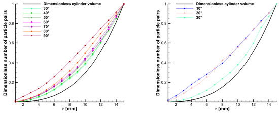 Figure 7 illustrates the curve of Ripley’s K-function for a uniform distribution of objects (black line), which is determined by the volume of a cylindrical region with a square cross-section depending on the change in radius . If the density of objects in a given area remains constant as the radius increases, then the curve for the number of pairs of particles in this area will be identical to the curve for the change in volume of a cylinder. Otherwise, if the curve is not identical to the volume of the cylinder, then this may indicate a clustering effect (particles grouped together) or, conversely, dispersion (particles spread far apart). The evaluation of distribution uniformity can also be carried out for a spherical shape; however, in the current case, after the divergent nozzle, the considered shape of the area is cylindrical. In this context, to evaluate volume uniformity, a cylinder is used as the corresponding geometric shape.