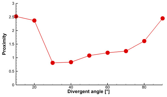 A graph of proximity change for different values of the divergent nozzle expansion angle is presented in Figure 12.