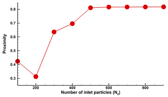 An additional analysis was conducted to test the dependency of resulting uniformity on the amount of particles used during simulation. As can be seen from Figure 13, the proximity converges to a certain value as the amount of particles increases. In this particular case, the value stabilizes starting from 500, hence the specific number of particles used in the aforementioned simulations. In other words, while lower amounts of particles lead to a decreased accuracy of modeling, increasing this number above 500 will raise the computational costs unnecessarily.