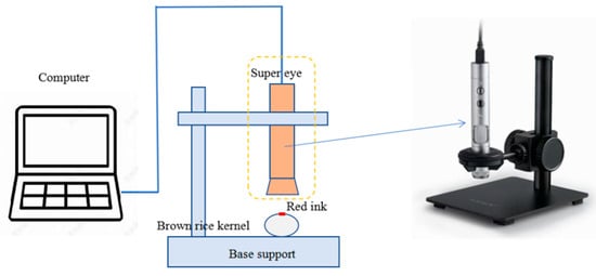 Estimation of equivalent crush contact area: the bottom of the cylindrical indenter (diameter was 2 mm) was coated with red coloring ink. The position of the probe was manually adjusted until it was just in contact with the brown rice kernel (no extrusion). As shown in Figure 5, the brown rice kernels were removed, Supereyes image equipment was applied to magnify and photograph the ink-impregnated area at a certain ratio, and the stained area was divided into a scale grid in Image J 1.48 software, as shown in Figure 6a, to estimate the area of the stained area for each test sample.
