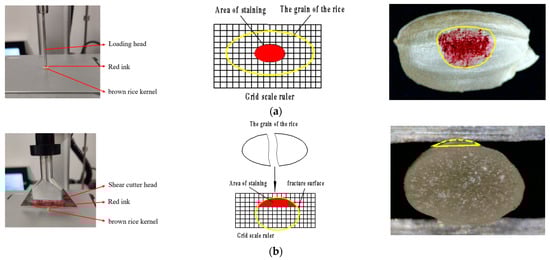 Calculation method of the maximum extrusion contact area: when the brown rice kernels were in the maximum extrusion state, the cylinder indenter completely contacted the brown rice kernels. Therefore, the cross-sectional area of the cylinder indenter was the maximum extrusion contact area (Snmax) at this time. Calculation method of the maximum shear contact area: the staining area corresponding to the displacement of the maximum shear force was analyzed and calculated using the same method as above. The test was repeated 20 times, and the mean value was the shear contact area at the maximum stress state (Sτmax).