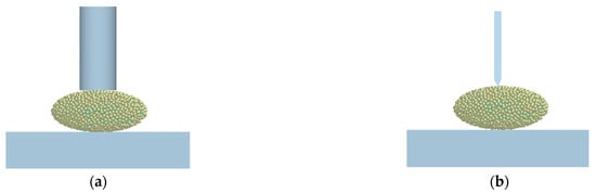 The critical normal stiffness (Cn) and critical shear stiffness (Cτ) can be calculated according to Equations (1) and (2), but the normal stiffness per unit area (Kn) and shear stiffness per unit area (Kτ) can only determine their value ranges. Therefore, we carried out EDEM simulation tests to calibrate Kn and Kτ. The simulation model shown in Figure 7 was established with EDEM software according to the actual scale. Simulation parameters are shown in Table 1 [33]. The quadratic regression orthogonal rotation combination test, with two factors and five levels, was carried out. The test levels were coded as −1.414, −1, 0, 1, and 1.414. The test index is the comprehensive error of extrusion and shear bench test and simulation test, expressed as: