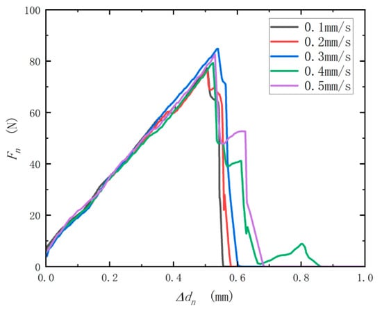 As shown in Figure 8, the extrusion test results show that there is no significant difference between “Fn-Δdn” curves measured at different pressure rates, indicating that the pressure rate has no significant influence on the results of the extrusion test. There is no significant difference in slope kn and yield value Fnmax of the “Fn-Δdn” curve at the linear stage under different pressure rates measured, as shown in Table 2.