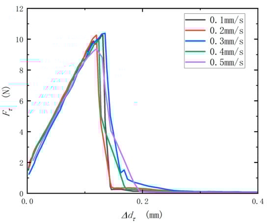 As shown in Figure 9, the shear test results show that there is no significant difference between the “Fτ-Δdτ“ curves of different shear rates, indicating that the shear rate has no significant influence on the results of the extrusion test. There is no significant difference in slope kτ and yield value Fτmax of the “Fτ-Δdτ” curve at the linear stage under different pressure rates measured, as shown in Table 3.