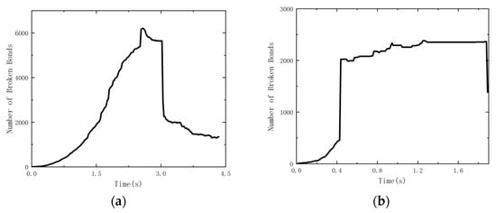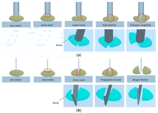 (a) Simulation of the extrusion crushing process of a number of broken bonds; (b) simulation of shear crushing process of a number of broken bonds.