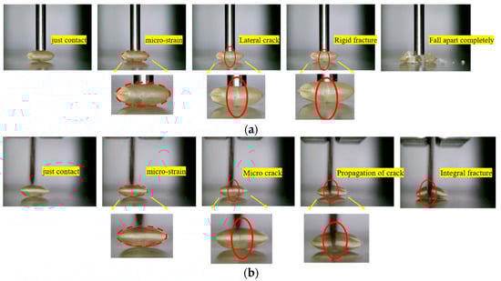 Since the crushing process of brown rice seed kernels occurs in a very short time when it is subjected to an extrusion test or shear test, it is difficult to analyze the process of its rupture under the action of external force. So, in this study, an observation device for the crushing process of brown rice kernels was designed, as shown in Figure 14, which consists of a texture meter, a computer, a high-speed camera, and a light source. When the texture meter performs the extrusion test or shear test according to the set parameters, the high-speed camera records the crushing process of brown rice seeds, as shown in Figure 15.