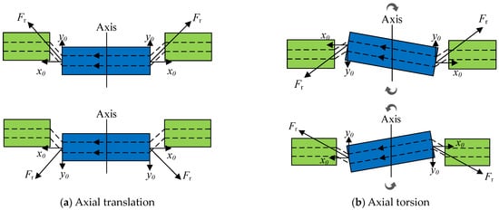 When the motor rotor occurs in the axial torsion, as shown in Figure 2b, the average air gap is changed; then, the electromagnetic force produces a torque in the opposite direction of motion to realize the return of the rotor. To sum up, it can be seen that the rotor can achieve passive suspension in the axial direction of 3 degrees of freedom based on the “magnetic resistance minimum principle”.