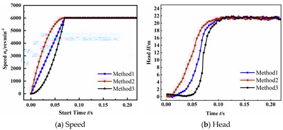 Figure 7 shows the variation in the speed and head of the centrifugal pump with time under the three start-up methods. Figure 7a shows that at any time during the start-up process of the centrifugal pump, the speed of method 2 is higher than that of method 1 and method 3. What is more, the speed growth rate of method 2 is the highest among the three start-up methods. From Figure 7b, it can be seen that during the start-up process from 0 to 0.07 s, the transient head of both methods 1 and 2 show a gradually increasing trend, while the transient head of method 3 shows a slow decrease and then a rapid increase. Method 3 reaches the minimum head value at t = 0.05 s and then begins to rise sharply. The head growth rate of method 3 during the period from t = 0.05 s to t = 0.07 s is significantly faster than the other two methods. In addition, the curve of method 3 intersects with the curves of method 1 and method 2. Before t = 0.02 s, the transient head of method 3 is the largest among all the methods, and after t = 0.025 s, the transient head of method 3 is the smallest among all the methods. Method 2 first reaches the design value of the head, followed by method 1, then method 3. When the pump runs to the rated speed, the transient heads of all three methods are greater than the design value. The reason is that the transient head of the pump includes the head under stable operating conditions and the additional head generated by inertia during the acceleration process. Because the additional head has been taken into consideration, the calculated head during the transient start-up process of the centrifugal pump is slightly higher than the designed value.