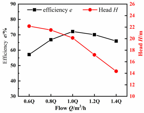 Figure 8. Flow–head and flow–efficiency curves of centrifugal pump in different flow rates.