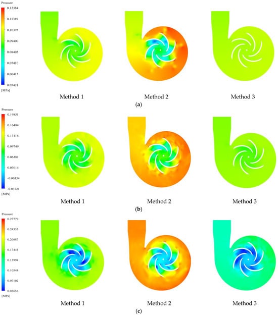 Pressure field analysis indicated that the pressure value of method 2 was the highest and that of method 3 was the lowest. With the three start-up methods, the internal pressure of the pump gradually increased with the duration of the operation, but the pressure change trends of the three were different. Method 2 developed into a high-pressure zone in a short period of time. Meanwhile, with method 3, the pressure was relatively low in the early stage of the start-up process, and then the pressure increased rapidly. Method 1 showed a uniform increase in the change pattern. At time tC, the pressure changes are the most significant, each increasing by 55.5%, 56.4%, and 61.43% compared to the previous moment. At time tD, when the pump has completed the transient start-up process, the pressure value of method 2 is 22.3% higher than method 1 and 25.9% higher than method 3. It was obvious that the pressure change trends of the three methods were related to the start-up characteristics.