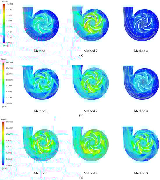 The six time points which were described in Section 3.2 were selected to analyze the flow field velocity distribution characteristics of the pump under three start-up methods. The specific results are shown in Figure 10a–f.