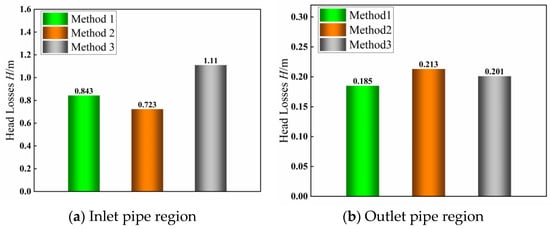 Regarding the different start-up methods, in the volute casing region, method 2 has the highest head losses, followed by method 1, and method 3 has the lowest head losses. In the impeller region, method 2 has the highest head losses, followed by method 3, and method 1 has the lowest head losses. In summary, head losses of these three methods are 3.895 m, 4.153 m, and 4.061 m, respectively. Method 1 is still the lowest. To further analyze this phenomenon, this study calculates the head losses of all flow components of the pump and determines the percentage of loss in each region, as shown in Figure 12. Figure 12 shows that among the three transient start-up methods, both the impeller region and the outlet pipe region exhibit lower head losses in method 1 when compared to the other two start-up methods. Furthermore, the total head losses in method 1 are also lower than the other two methods. It indicates that the total hydraulic losses in method 1 are also the lowest, highlighting its superior efficiency. It is, therefore, obvious that method 1 stands out as the most efficient option.