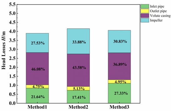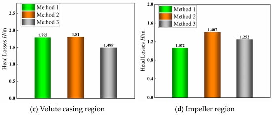 Hydraulic losses not only reflect the efficiency of the pump but can also indirectly support the analysis presented earlier. The flow components of a centrifugal pump mainly include the inlet pipe, impeller, volute casing, pump chamber, and outlet pipe. Considering the special structure of BDDCPS used in this study, the combined analysis of the pump chamber structure and volute casing structure was conducted to determine the hydraulic losses situation.