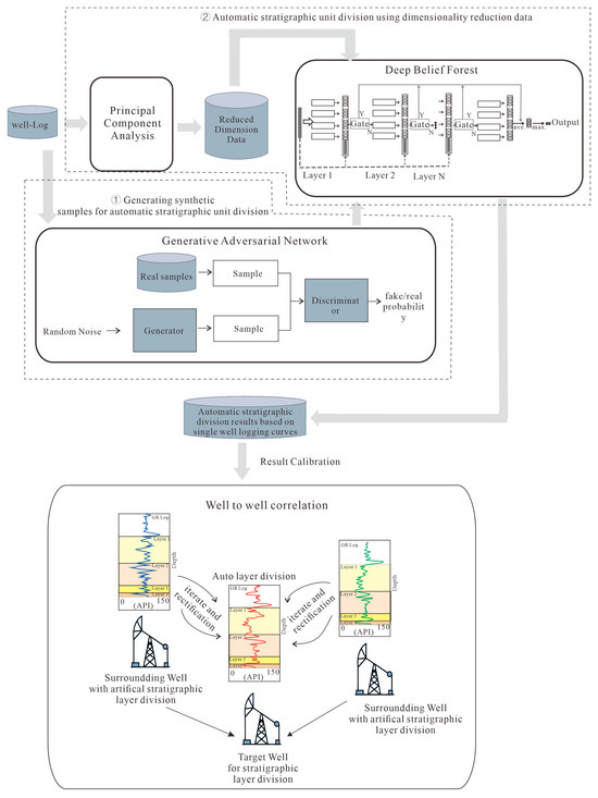 This paper proposes a novel approach, termed DRAG, for well log analysis and shale boundary identification, as illustrated in Figure 1. Specifically, the original well log curve data undergo dimensional reduction using the PCA algorithm. Subsequently, a GAN network is employed to generate synthetic samples of the well log curve data, aiming to achieve a balanced quantity of samples across different categories. The deep belief forest algorithm is then utilized for well log curve stratification. Lastly, the calibration threshold function of the layer division result for a single well is constructed, and the layer division result is corrected by considering the stratigraphic division schemes of neighboring wells.