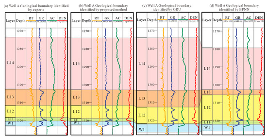 Figure 6a displays the stratigraphic curve annotated manually by experts. Figure 6b presents the stratigraphic curve results yielded by the method proposed in this study. Figure 6c depicts the results of well log curve stratification carried out using the gated recurrent unit algorithm, while Figure 6d shows the outcomes of well log curve stratification performed via the backpropagation neural network (BPNN) algorithm. The comparative analysis of these results emphasizes that the method introduced in this study possesses superior classification accuracy and performance.