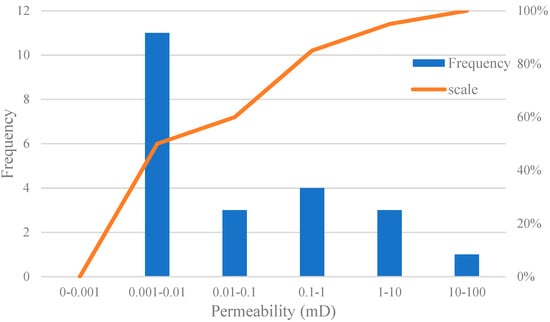 The H oilfield is located in the composite fault zone in the south of the Huizhou depression in the Pearl River Mouth Basin. The main target zones are the Wenchang Formation and Buried Hill. The depth of the Buried Hill reservoir is 3450~4321 m, the upper part of the reservoir is thick diorite, the middle part is tectonic schist and basaltic andesite, and the bottom is granite. As shown in Figure 2, the average porosity of the Buried Hill is 4.6%, and the average permeability is 2.0 mD, which classifies it as a typical low-permeability reservoir. The geothermal gradient of the oilfield is 3.56 °C/100 m, and the pressure coefficient is 1.027~1.076, which falls within the normal temperature and pressure system.