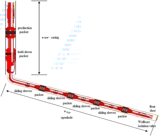 The H-11 well has a vertical depth of 4000 m and a horizontal section length of 656 m; the casing structure consists of an open hole that is 24 inches + 13.375 inches + 9.625 inches + 8.5 inches. In the beginning, in order to improve production efficiency, the 3.5-inch oil pipe was embedded in the casing for direct production. Then, the 4.5-inch blind pipe was inserted into the horizontal open hole section for fracturing. Considering the special offshore operating condition, the fracturing treatment adopts the platform operation mode, and the operation equipment needs to be placed in the space of the modular drilling rig yard. Considering the wellbore condition and the limited space, the multistage fracturing technique with open-hole packer + sliding sleeves was adopted. The schematic diagram of a fracturing pipe string can be seen in Figure 4. In order to communicate hydraulic fractures and natural fractures efficiency, the concept of creating a complex fracture network by a “high pump rate + slickwater fluid system” was introduced.